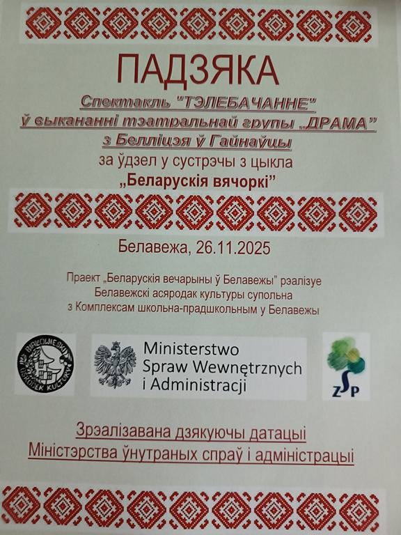 26 лістапада 2025 года па запрашэнні дырэктара Белавежскага культурнага цэнтра спадара Марка Зубрыцкага наша школьная тэатральная група «Драма» выступіла на «Беларускaй вечарыне» у вышэйзгаданай установе. Нашы юныя акцёры выканалі гумарыстычную інсцэніроўку «Тэлебачанне», якую папярэдзіла выступленне вакальнай групы «Сунічкі» з Белавежскага школьна-дашкольнага комплексу. Нашы ліцэісты зноў былі на вышыні, атрымаўшы бурныя апладысменты ад гледачоў і пахвалу ад арганізатараў мерапрыемства. Гэта была апошняя пастаноўка «Драмы» ў такім складзе, таму я хацеў бы падзякаваць усім акцёрам за незвычайную адданасць справе, запал і творчую энергію, якія вы прыўнеслі ў наш сумесны тэатральны праект.