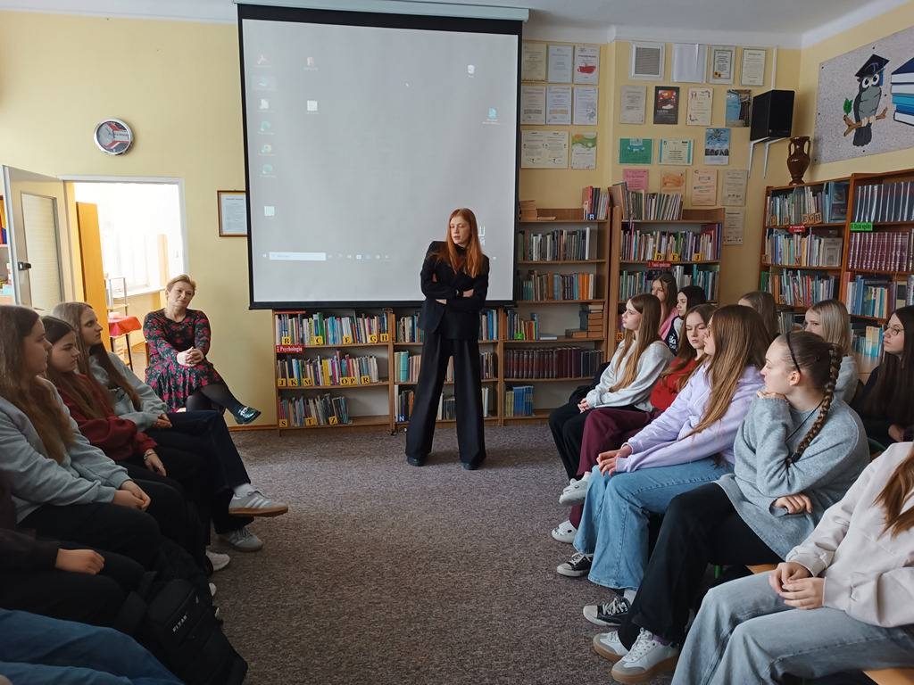 W dniu 11.02.2026 w czytelni szkolnej odbyło się spotkanie uczniów klas pierwszych A i B z absolwentką liceum Anną Bielawską, która obecnie pracuje jako aktorka i piosenkarka. Zagrała m.in. w serialu „Dewajtis”, filmach „Frestyle” i „Poskromienie złośnicy 2”, znakomicie wystąpiła na 45. Przeglądzie Piosenki Aktorskiej (po polsku i białorusku). Ania dużo opowiadała o przywiązaniu do swojej małej ojczyzny oraz korzyściach z nauki języka białoruskiego. Odpowiadając na pytania wyjaśniła, że wynagrodzenie w branży artystycznej jest bardzo zróżnicowane i zależy m.in. od doświadczenia, popularności, rodzaju projektu oraz częstotliwości zleceń. Innym tematem poruszonym podczas spotkania był stres towarzyszący pracy artystycznej. Uczniowie pytali, czy tremę można pokonać i jak wygląda to w praktyce. Gościni przyznała, że stres jest częścią zawodu i może pojawiać się nawet u doświadczonych osób. Na zakończenie absolwentka zachęciła młodzież do rozwijania pasji, próbowania różnych możliwości i niepoddawania się w obliczu trudności.